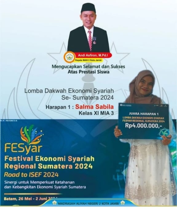Batam, 2 Juni 2024 – Salma Salsabila, siswa kelas 11 MAN 2 Kota Jambi, berhasil membawa nama baik Jambi dalam ajang Festival Ekonomi Syariah (Fesyar) tingkat Regional Sumatera yang diadakan di Batam. Acara ini berlangsung dari tanggal 26 Mei hingga 2 Juni 2024 dan merupakan bagian dari lomba dakwah remaja nasional yang diselenggarakan oleh Bank Indonesia (BI).