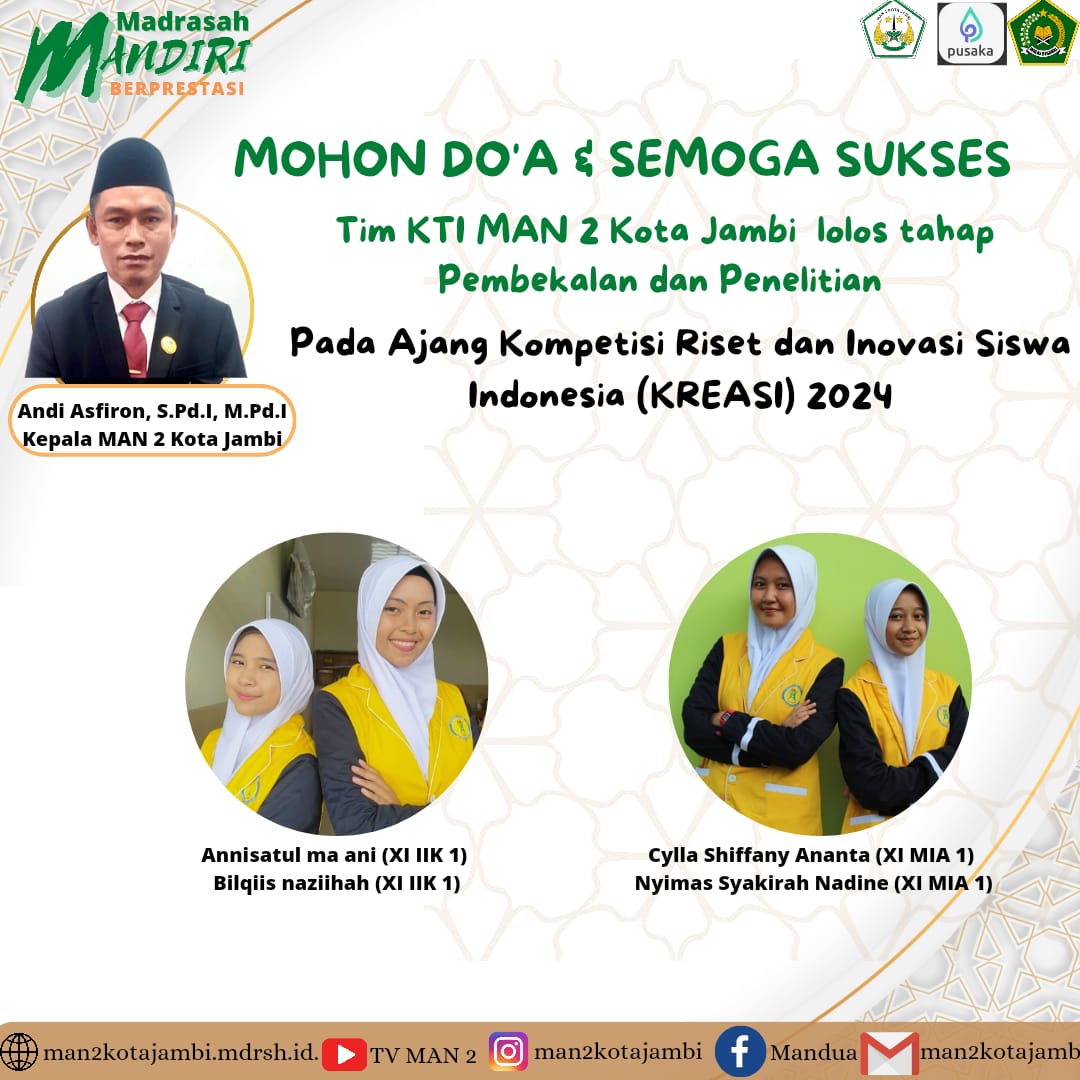 Kota Jambi – Kepala MAN 2 Kota Jambi, Andi Asfiron, mengharapkan doa dan dukungan dari seluruh masyarakat untuk TIM KTI (Kelompok Kerja Ilmiah) sekolahnya yang akan berpartisipasi dalam Ajang Kreasi 2024. Dalam ajang ini, lima tim dari MAN 2 Kota Jambi akan melakukan penelitian langsung ke lapangan, memperlihatkan dedikasi dan kreativitas mereka.