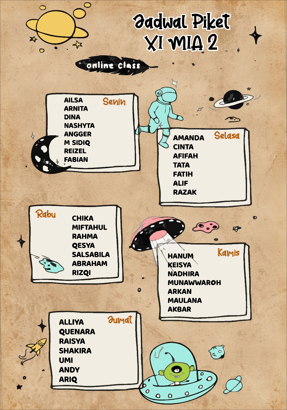 MAN 2 Kota Jambi kembali menunjukkan semangat kebersamaan melalui program BERSERI (Bersih, Rapi, Sehat, dan Indah). Dalam upaya meningkatkan kebersihan dan kenyamanan lingkungan sekolah, siswa-siswi MAN 2 Kota Jambi membentuk tim piket harian. Kelas XI MIA 2, misalnya, telah menyusun jadwal piket yang melibatkan semua siswa secara bergantian setiap hari.