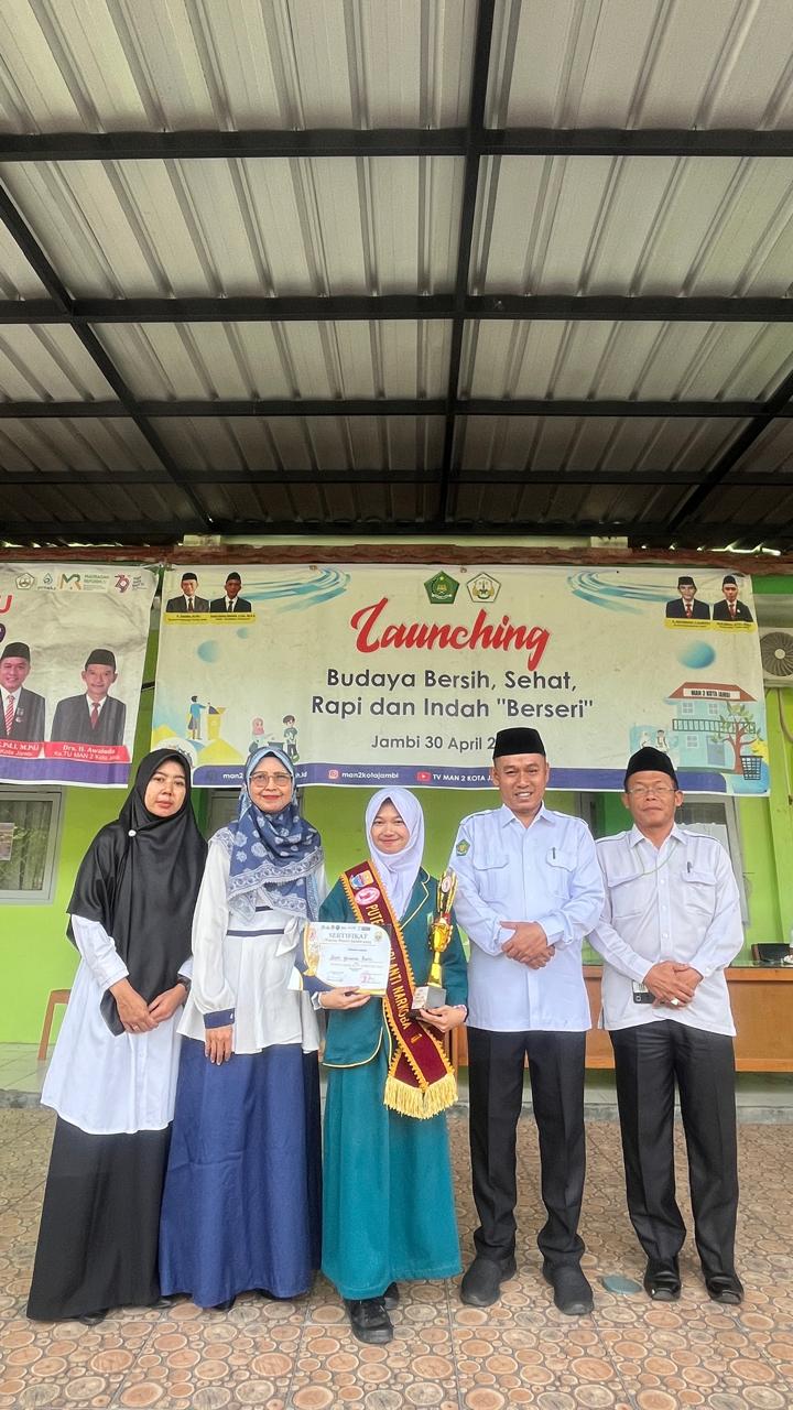 Jambi, 10 Februari 2025 – Suci Yolanda Putri, siswi kelas 12 MIA 4 MAN 2 Kota Jambi, resmi menyandang gelar Puteri Anti Narkoba 2025 setelah menjuarai Pemilihan Putera Puteri Jambi 2025. Sebagai bentuk apresiasi, Kepala MAN 2 Kota Jambi, Andi Asfiron, S.Pd.I., M.Pd.I., secara langsung menyematkan selempang kemenangan dan menyerahkan piala kepada Suci setelah upacara bendera pada Senin, 10 Februari 2025.