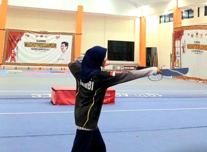 Kota Jambi — Di tengah dentuman musik latihan dan pekikan semangat pelatih, seorang siswi MAN 2 Kota Jambi tampak fokus mengulang gerakan jurus Wushu dengan penuh konsentrasi. Dialah Sukma Tri Nur Azizah, atlet muda berbakat yang kini bersiap menuju PON Bela Diri 2025 di Kudus, Jawa Tengah. Nama Sukma bukan baru di dunia bela diri. Tahun lalu, ia telah mencicipi panasnya persaingan tingkat nasional dalam ajang PON XXI Aceh–Sumut 2024, di mana ia mewakili Provinsi Jambi pada cabang olahraga Wushu. Meski belum membawa pulang medali emas, pengalaman tersebut menjadi batu loncatan berharga yang membentuk ketangguhan dan kematangan mentalnya sebagai atlet.