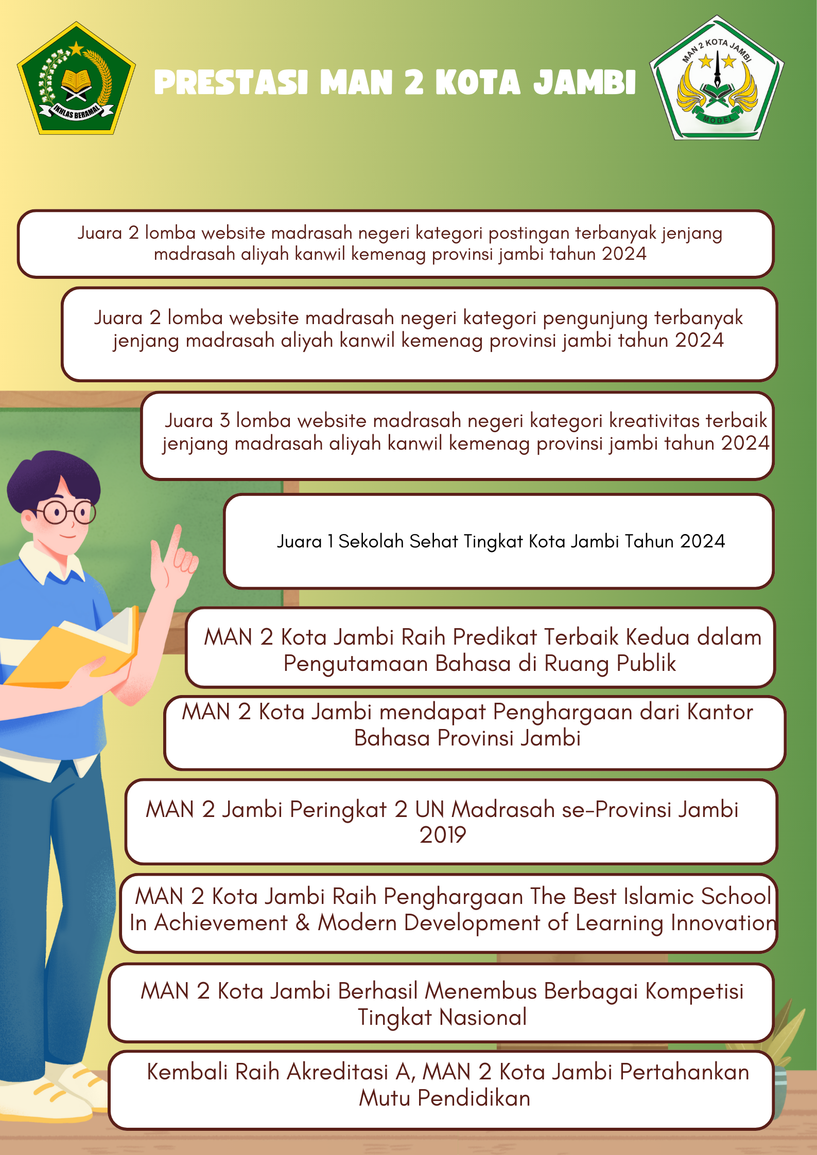 Selamat Datang di Website Resmi MAN 2 Kota Jambi # Olimpiade Madrasah Indonesia Tingkat Kota Jambi bertempat di MAN 2 Kota Jambi 9-10 September 2025 # Selamat Datang Dikawasan Zona Integritas Wilayah Bebas Dari Korupsi (WBK) Wilayah Birokrasi Bersih Dan Melayani (WBBM) MAN 2 Kota Jambi # MAN 2 Kota Jambi BERSERI ; Bersih Sehat Rapi Indah # Selamat datang di website resmi MAN 2 Kota Jambi # Rintisan kelas Internasional di Provinsi Jambi
